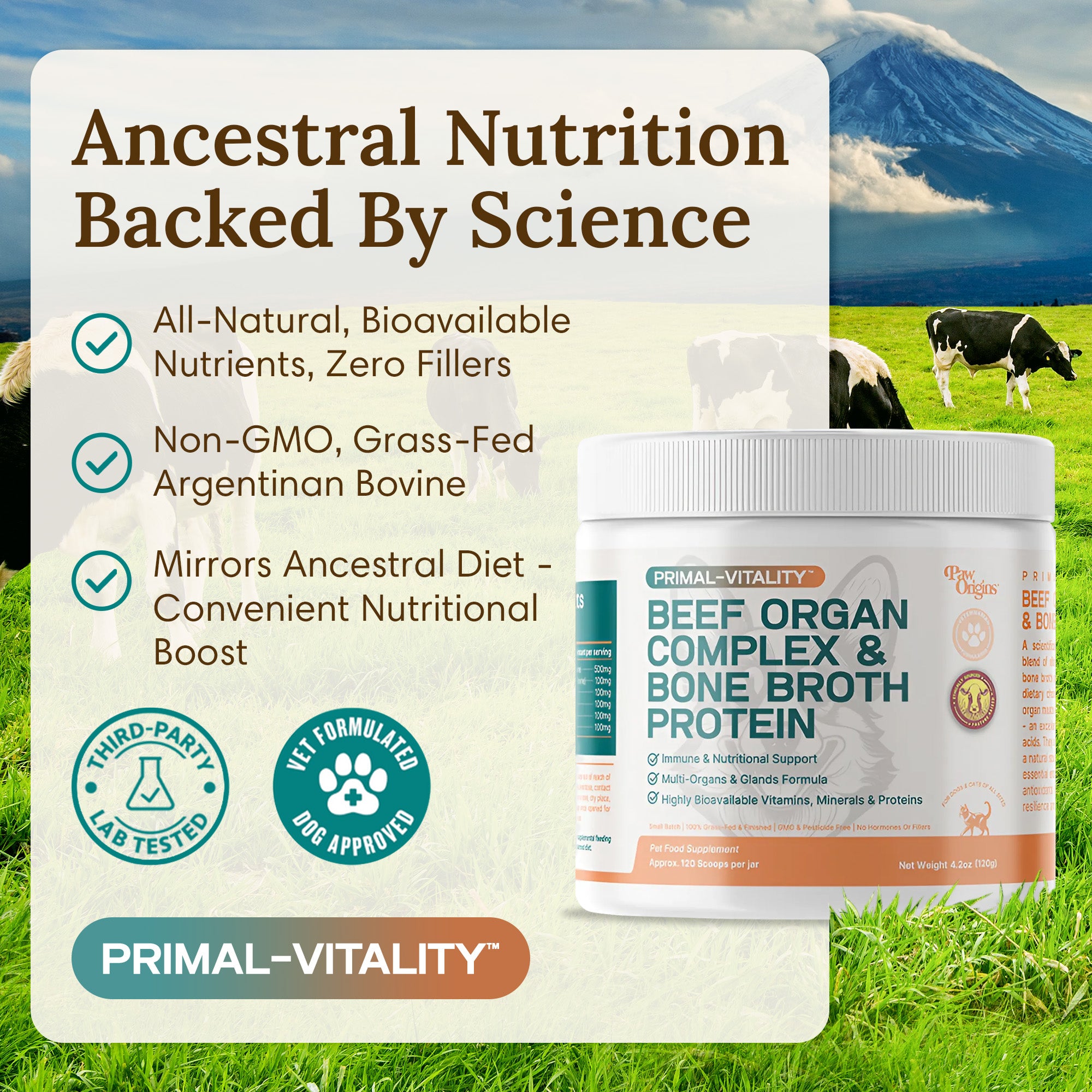 The result is our scientifically crafted and balanced formula, Primal-Vitality™, beef organ supplement, which offers optimal & highly bioavailable nutrition with every serving.