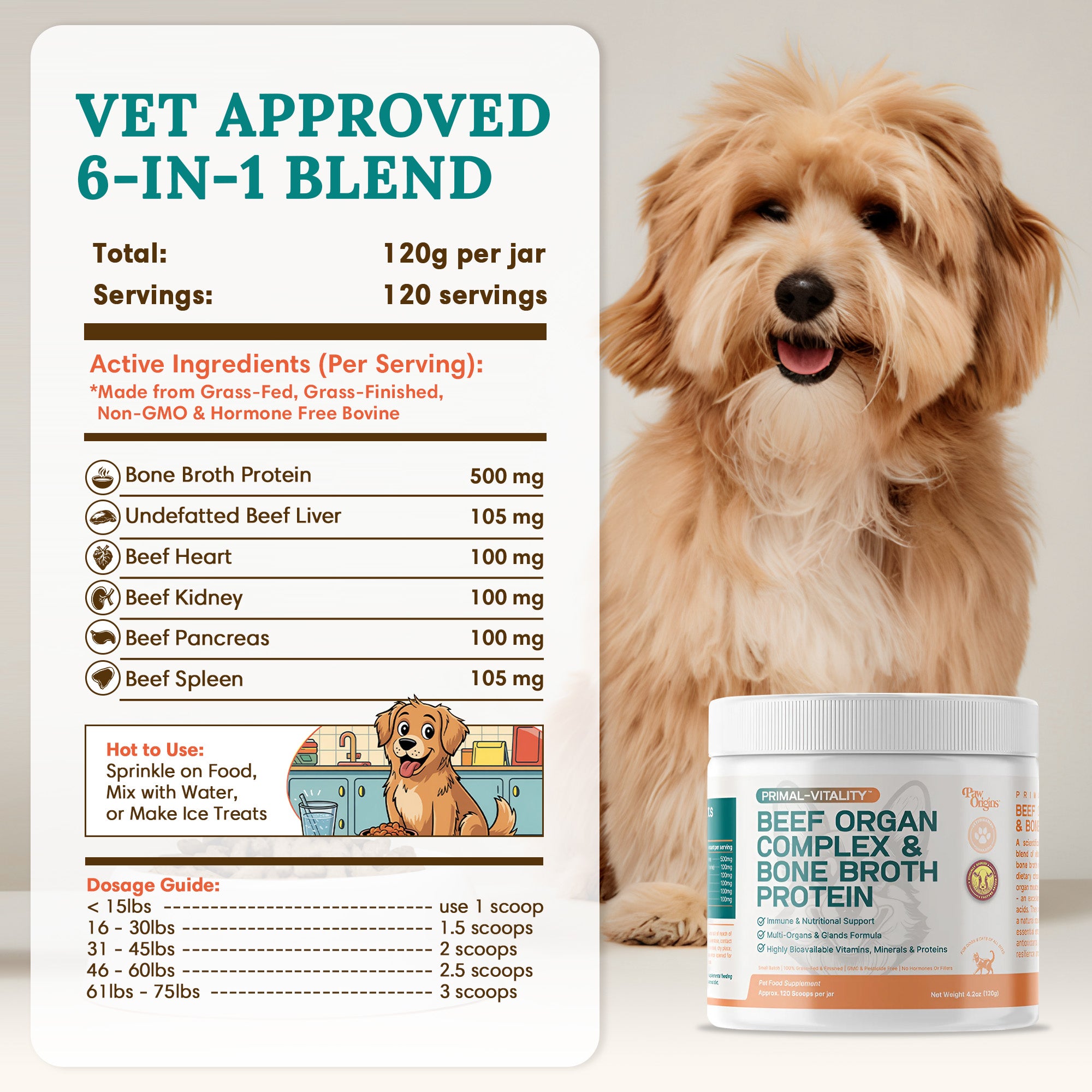 Each jar of Primal-Vitality™ contains 120 servings, equivalent to 120g. For dogs/cats weighing less than 50 pounds, the recommended dosage is 2 scoops per day, meaning a single jar will last approximately 45 days.