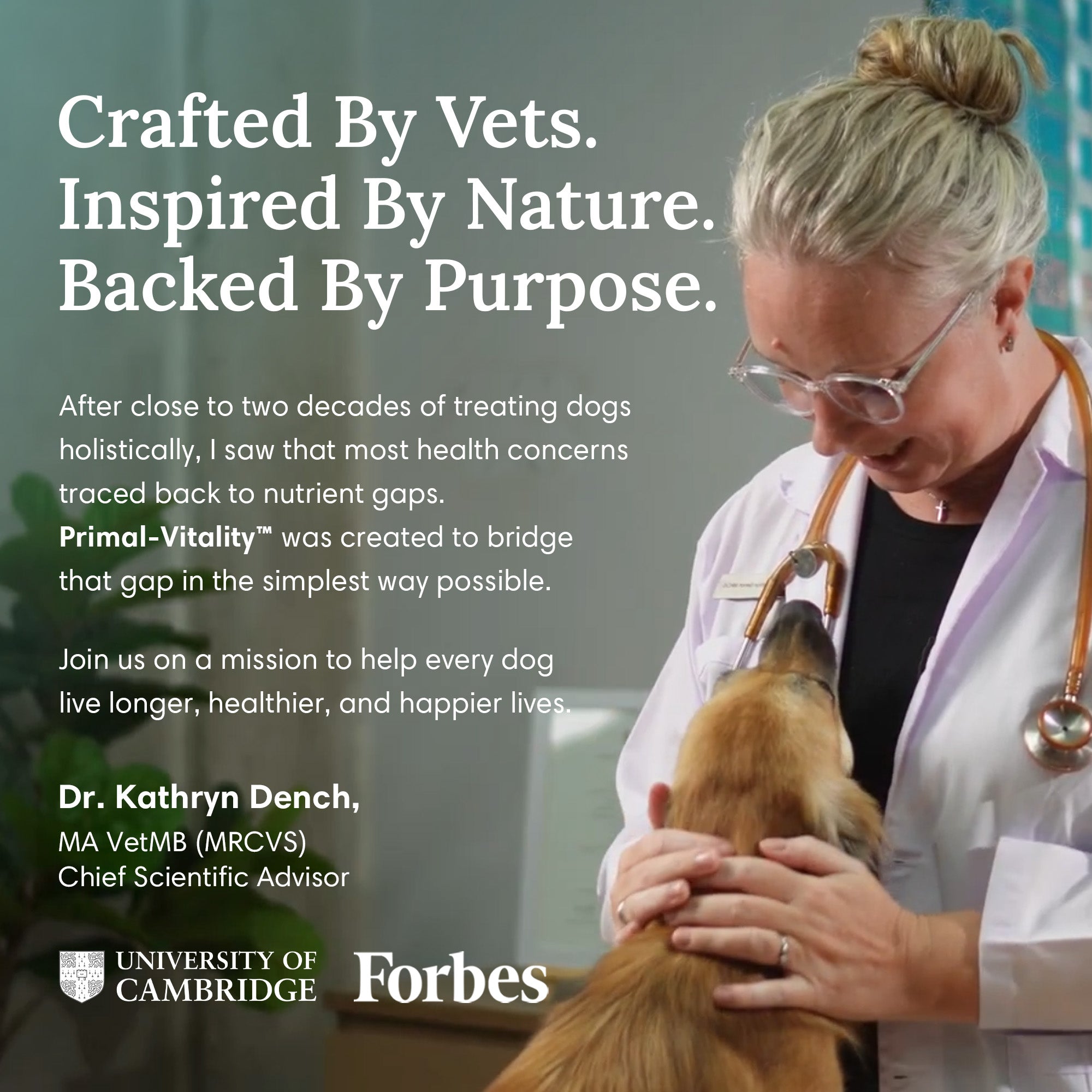 Primal-Vitality™, Organ Powder for Dogs and Cats, was created with the help of esteemed Cambridge Veterinarian, Dr. Kathryn Dench (MA VetMB, MRCVS), an expert veterinarian who has spent the last 20 years in the field of integrative and holistic veterinary care.