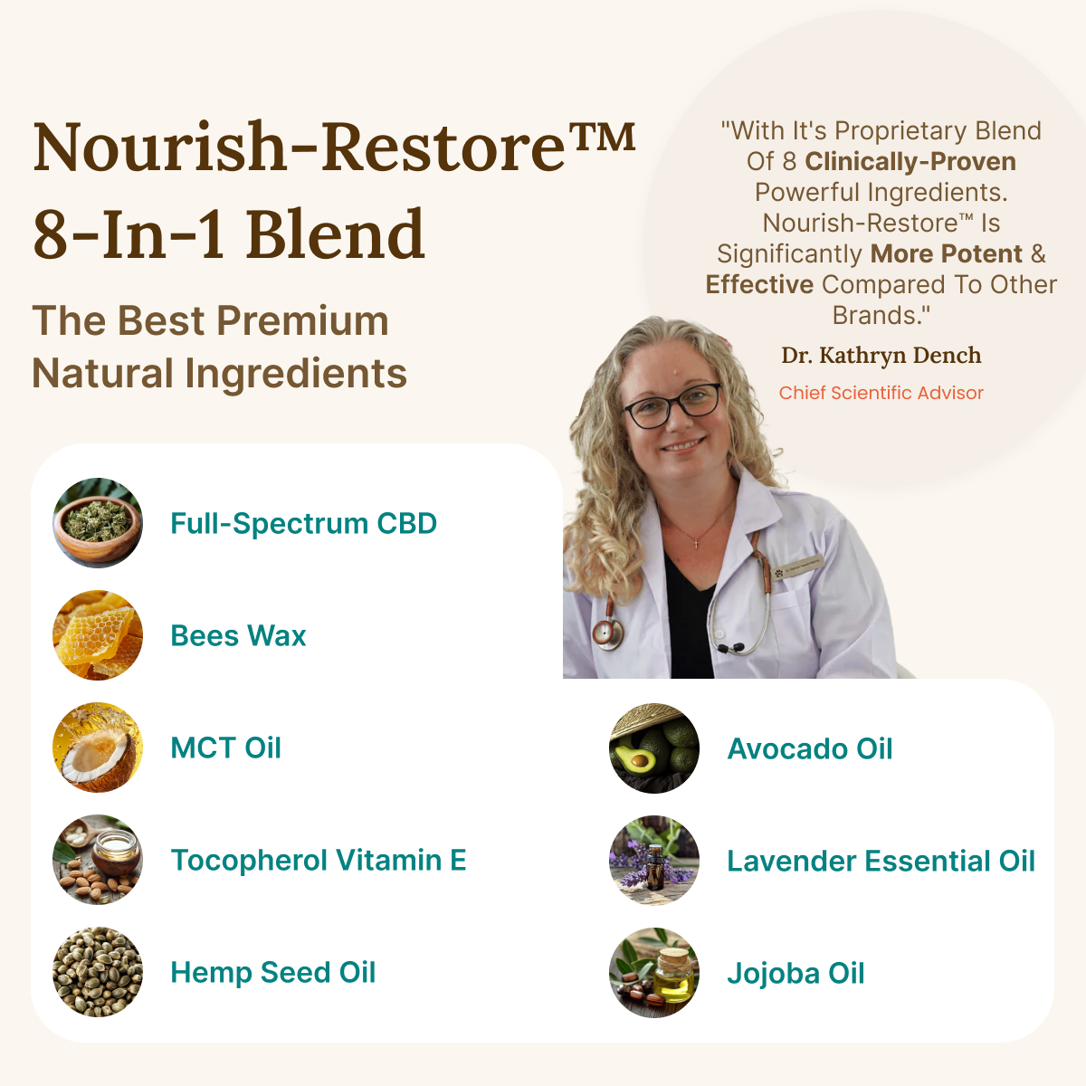 Unlike standard treatments that only mask these symptoms, Nourish-Restore™ Balm uses full-spectrum CBD to calm inflammation and natural oils to restore and strengthen the skin’s barrier, providing long-term relief and protection.