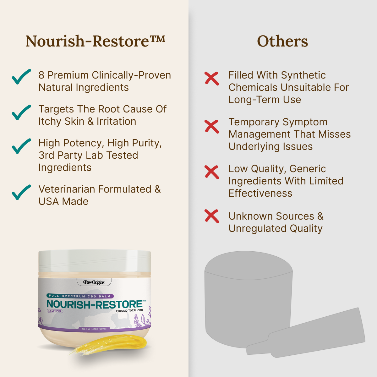 Nourish-Restore™ stands out with its high potency, full-spectrum CBD extract, sun-grown organic hemp, and natural, skin-loving ingredients. Our formula includes beeswax for protection, antioxidant-rich Vitamin E, and soothing lavender essential oil, ensuring maximum effectiveness. We prioritize quality with third-party lab testing and ethically sourced ingredients, offering a balm you can trust for your pet’s health.