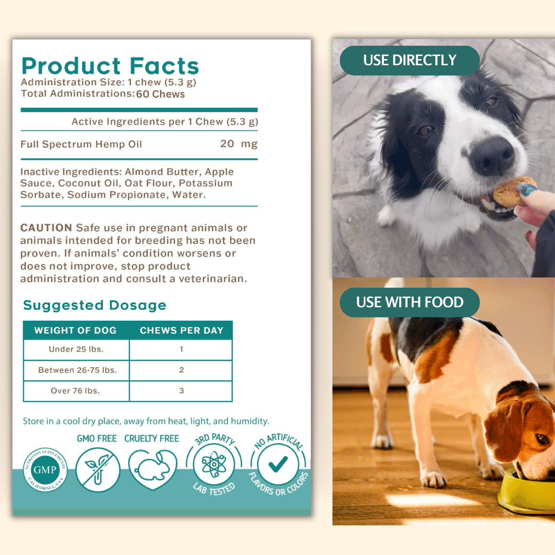 Cornell University’s study showsCBD dog chew's effectiveness in managing inflammation without adverse side effects or psychoactive properties. Dog owners report seeing quick improvements in their pet’s mobility and pain reduction.