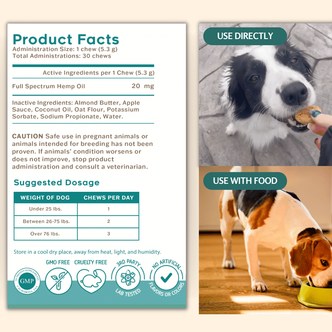 Cornell University’s study showsCBD dog chew's effectiveness in managing inflammation without adverse side effects or psychoactive properties. Dog owners report seeing quick improvements in their pet’s mobility and pain reduction.