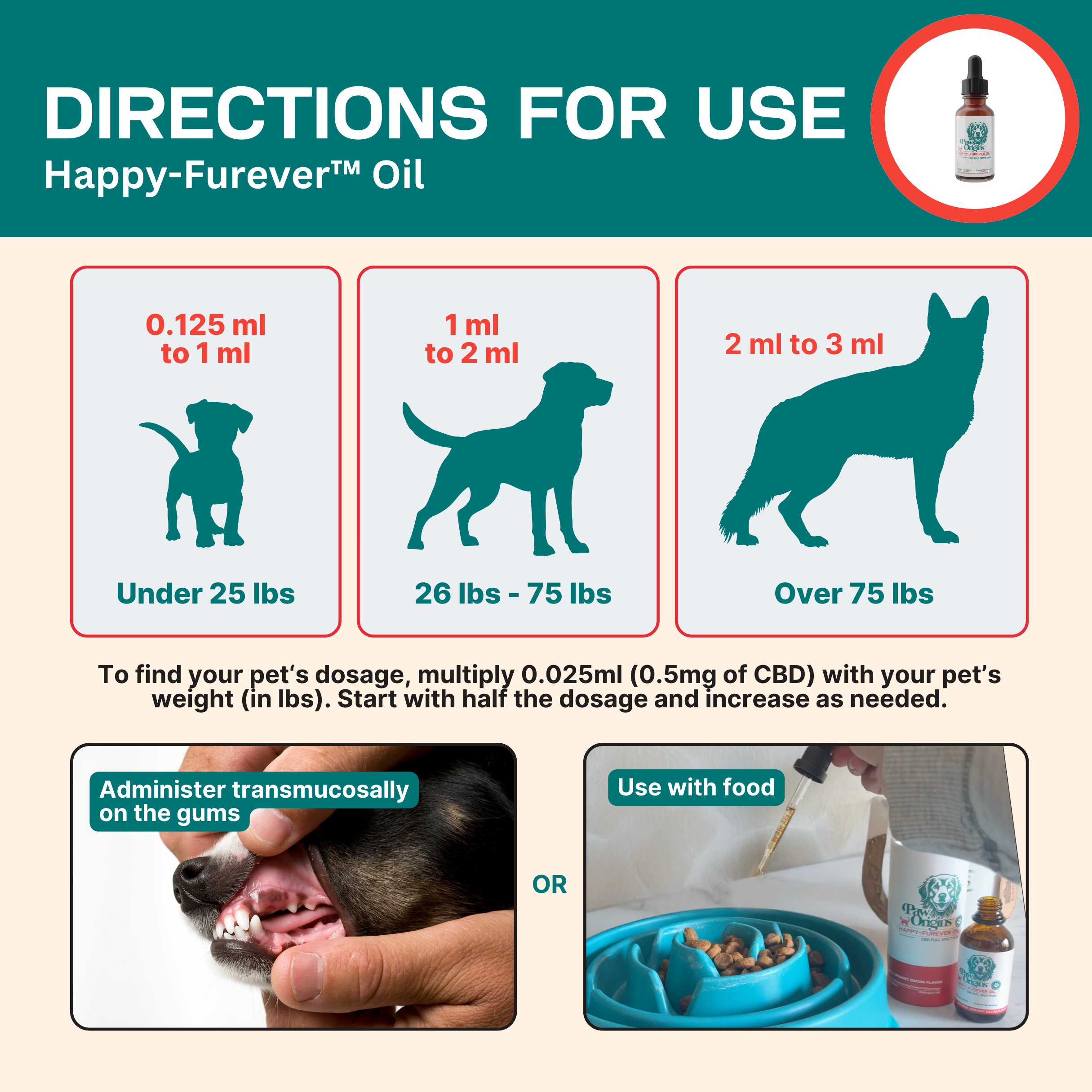 •	Oil: Each 0.025ml of Happy-Furever™ contains 0.5mg of CBD (e.g., a 10lb dog gets 5mg = 0.25ml).