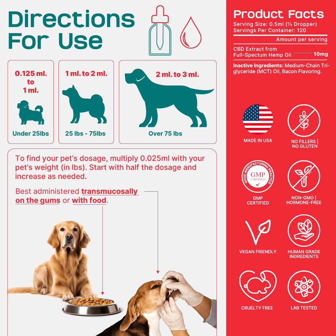 The rule of thumb for our bottles is to use 0.25ml per 10lbs of body weight, or 0.025ml per 1lbs of body weight. OR 0.5mg of CBD oil for pets per 1lb of body weight.