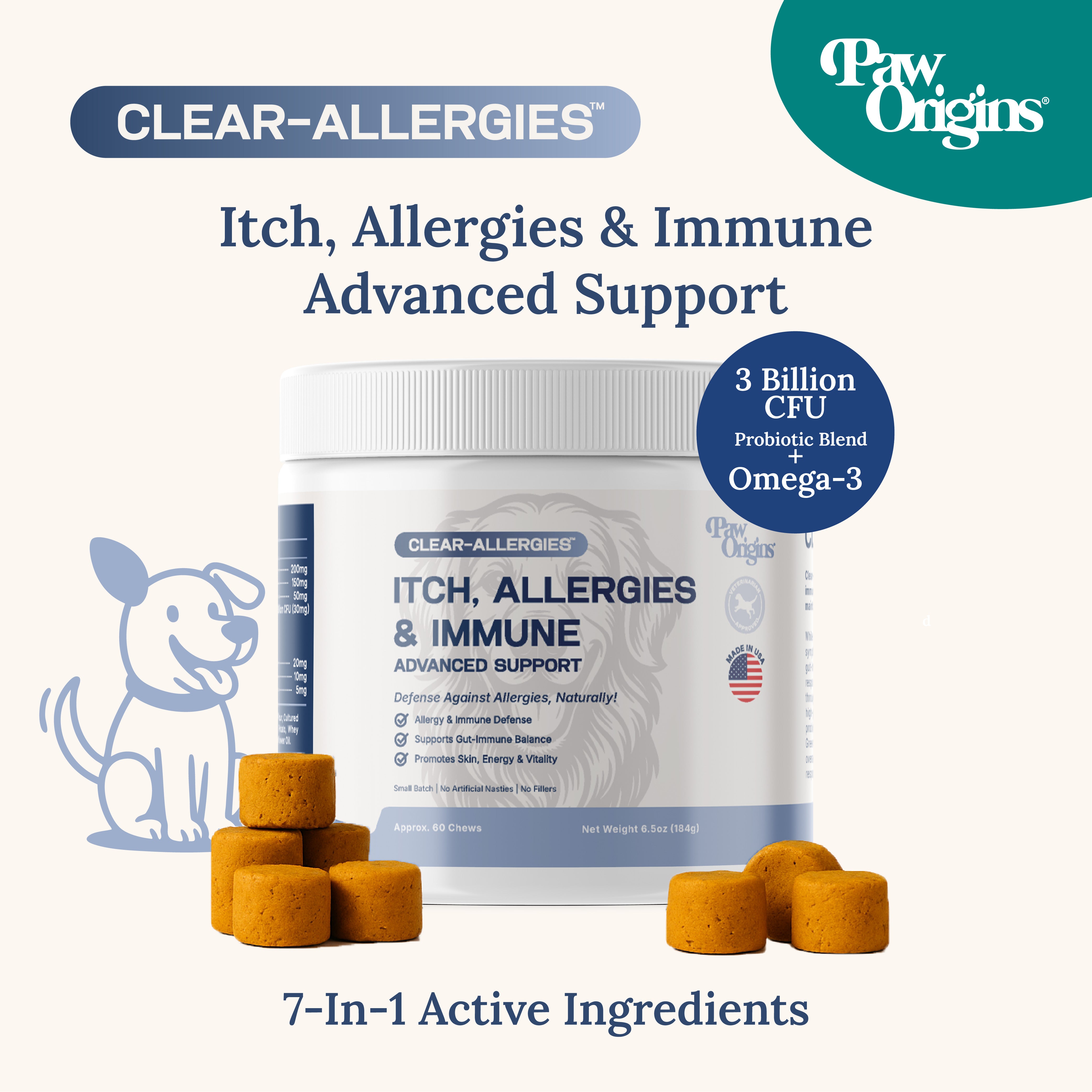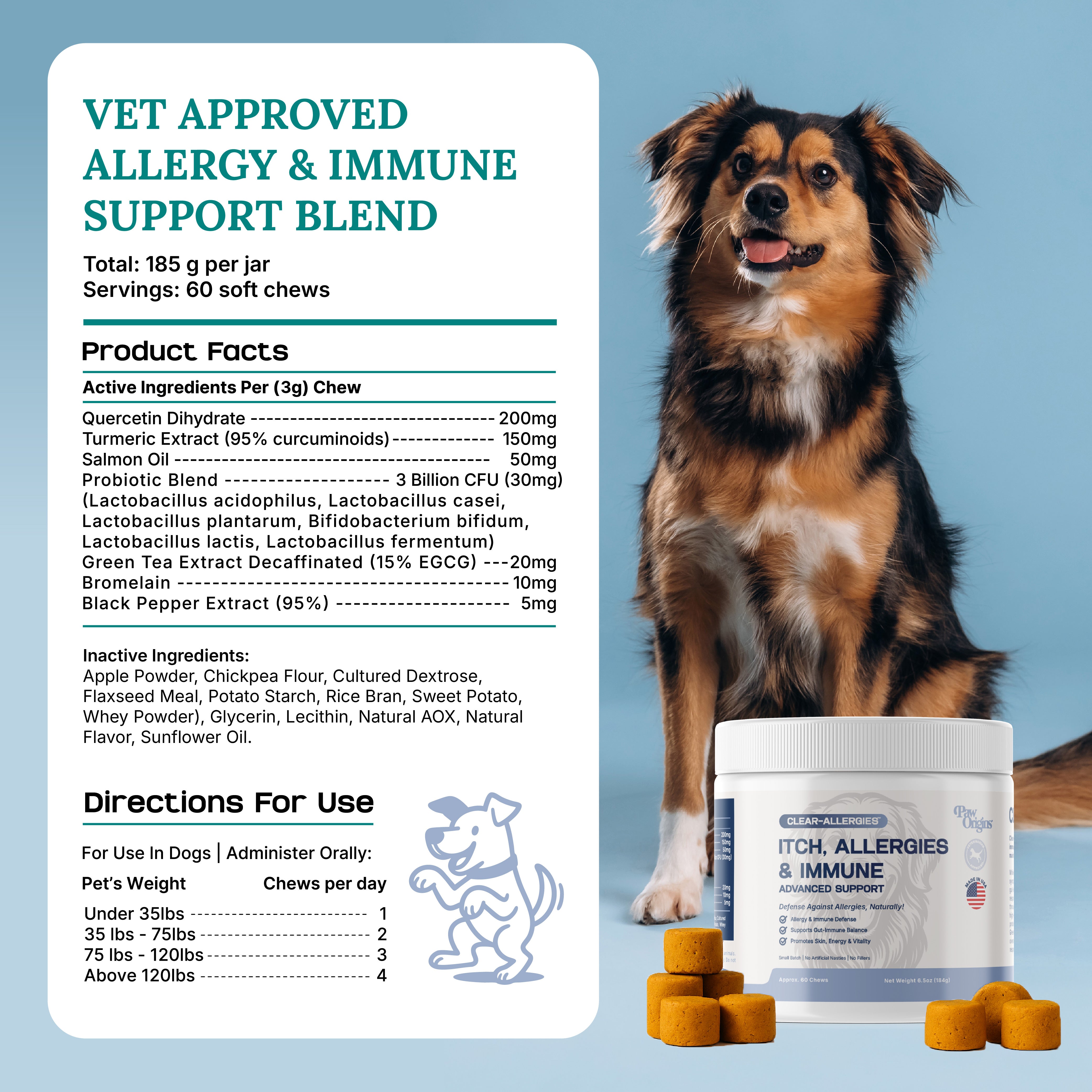 Clear-Allergies™ delivers a science‑backed blend of multiple scientifically proven all-natural ingredients like Quercetin, Curcumin, probiotics (3 Billion CFU), and EGCG to help break the allergy cascade at its root. It supports gut balance, calming the immune response, and promoting healthy histamine levels for lasting relief. Plus, dogs love the delicious bacon flavor!