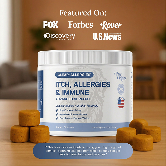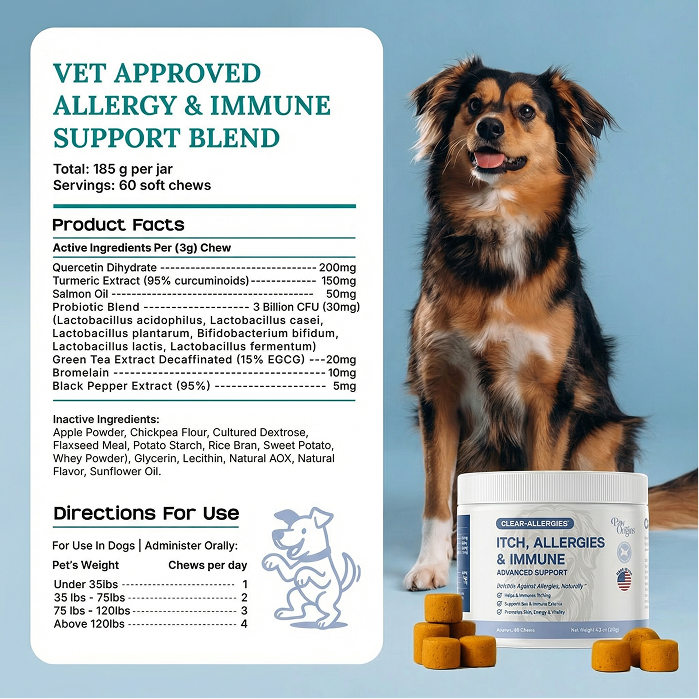 Clear-Allergies™ delivers a science‑backed blend of multiple scientifically proven all-natural ingredients like Quercetin, Curcumin, probiotics (3 Billion CFU), and EGCG to help break the allergy cascade at its root. It supports gut balance, calming the immune response, and promoting healthy histamine levels for lasting relief. Plus, dogs love the delicious beef flavor!