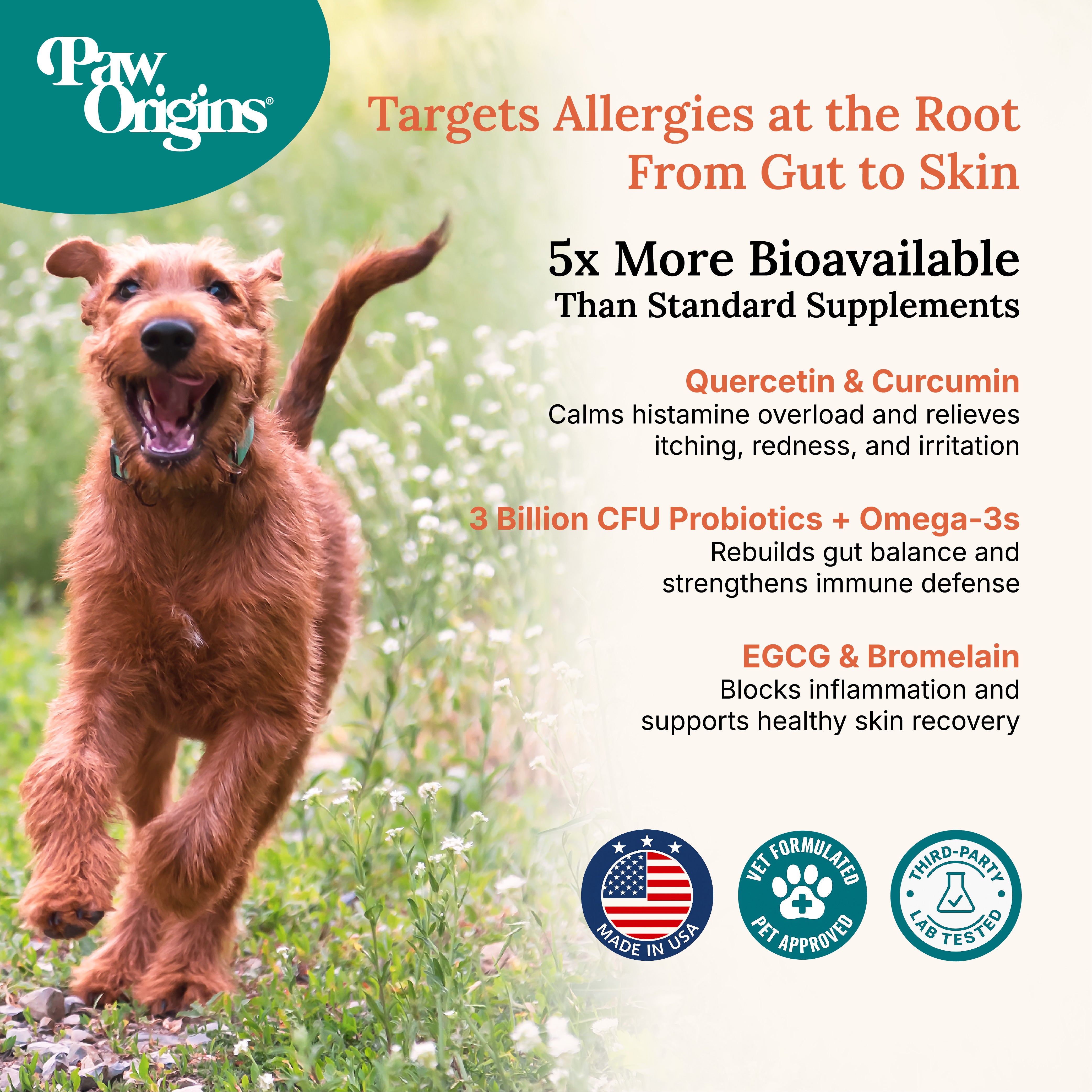 Clear-Allergies™️ is the world's first comprehensive canine formula specifically designed to break the allergy cycle at its root. While most supplements offer 1-2 ingredients, we deliver seven clinically-backed compounds working together: Quercetin Dihydrate (nature's Benadryl), 95% Purified Curcumin (20x more effective than turmeric), 3 Billion CFU Probiotic Blend, Green Tea Extract (EGCG), Salmon Oil, Bromelain, and Black Pepper Extract. Each ingredient is dosed for maximum therapeutic effect and manufactured in a GMP-certified, FDA-registered facility in Miami, Florida using premium USA-sourced ingredients.