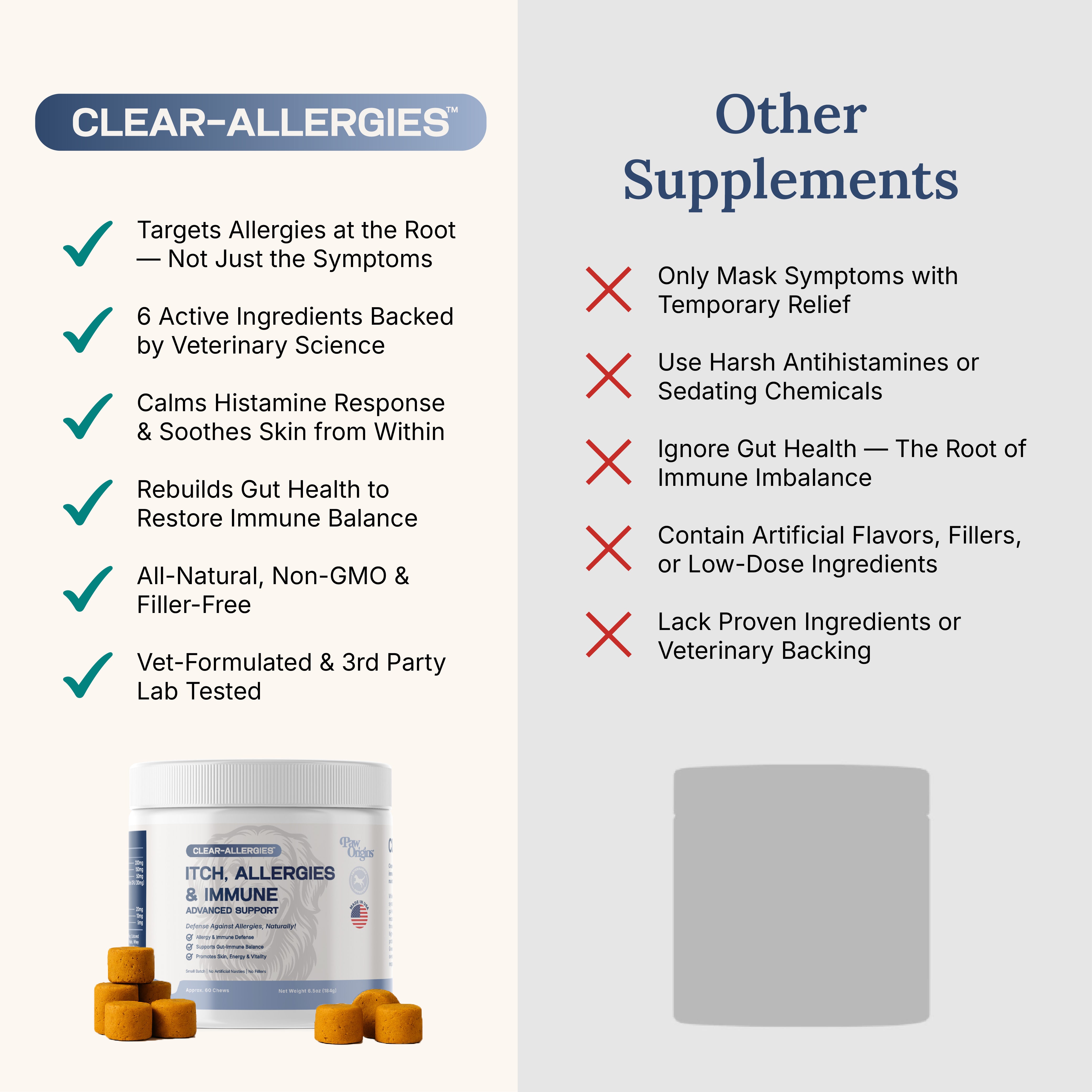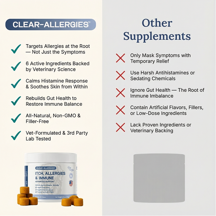 While some veterinarians recommend Benadryl for temporary symptom relief, it only masks the reaction after histamine has already been released—like turning off the fire alarm while the house is still burning. Plus, antihistamines can cause drowsiness, behavioral changes, and digestive upset. Clear-Allergies™️ takes a different approach by preventing the histamine cascade at its source, rebalancing the immune system, and restoring gut health—offering long-term relief without the side effects of pharmaceutical drugs.