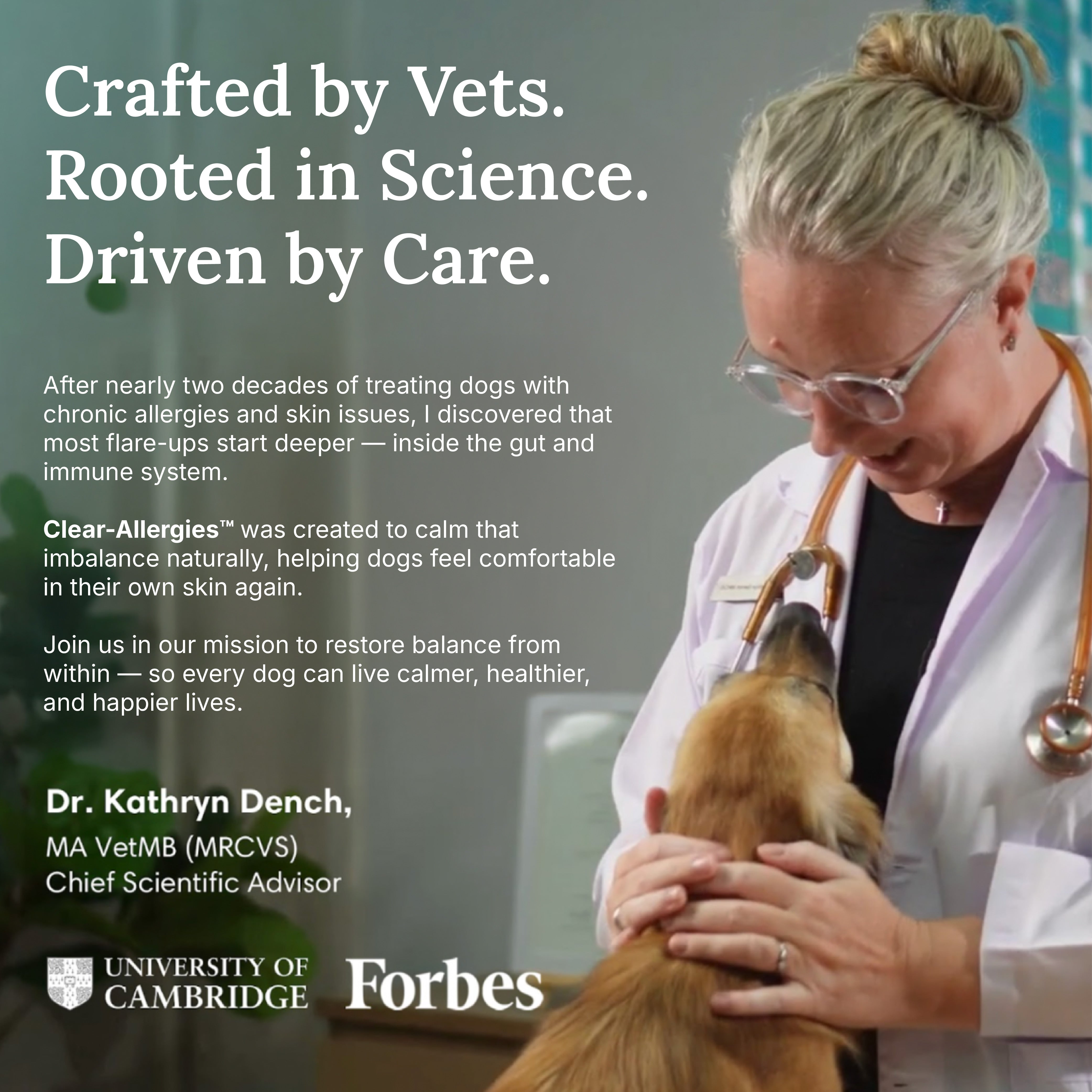 Developed with Dr. Kathryn Dench (MA VetMB, MRCVS), an integrative veterinarian with 20 years of experience. Crafted to support whole‑dog wellness rather than merely suppressing symptoms.