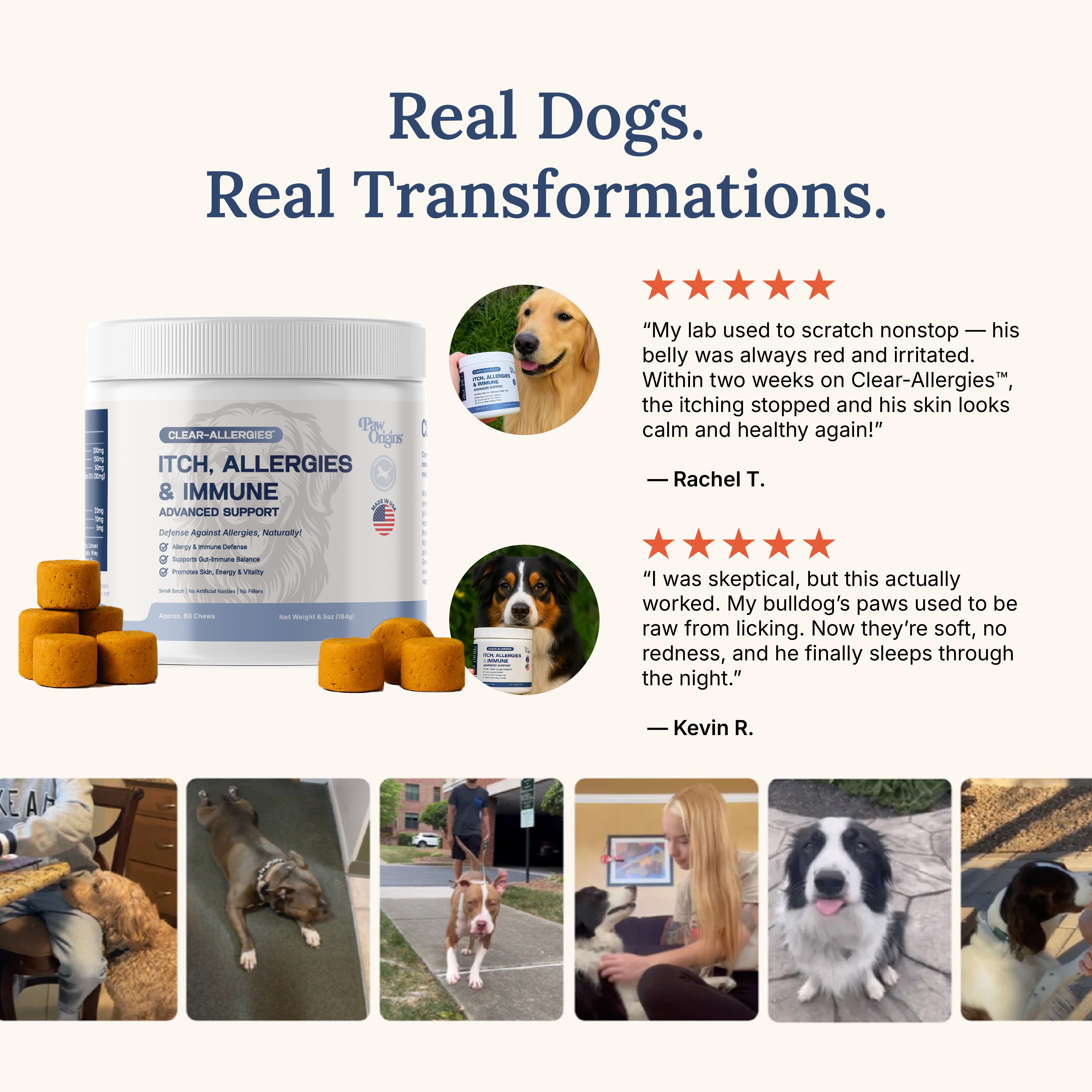 Most allergy chews fall short because they contain trendy ingredients at doses too weak to matter—or they only address surface symptoms. Clear-Allergies™️ is different. Each ingredient is included at precise, therapeutic doses backed by clinical science. We target the gut, regulate IgE antibodies, stabilize mast cells, and calm histamine overload—interrupting the allergy cycle at every phase. That's why dog owners report dramatic improvements when other products have failed.