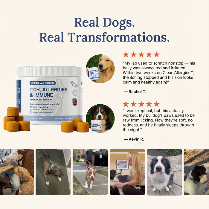 Many dogs begin showing improvement within the first few days as itching starts to subside. For deeper, lasting transformation—especially in dogs with years of immune sensitivity—you'll typically see dramatic results within 2 to 4 weeks of consistent daily use. However, because Clear-Allergies™️ addresses the root cause rather than just symptoms, once the immune system is rebalanced, it tends to stay that way. We recommend a 3-6 month supply for optimal results.