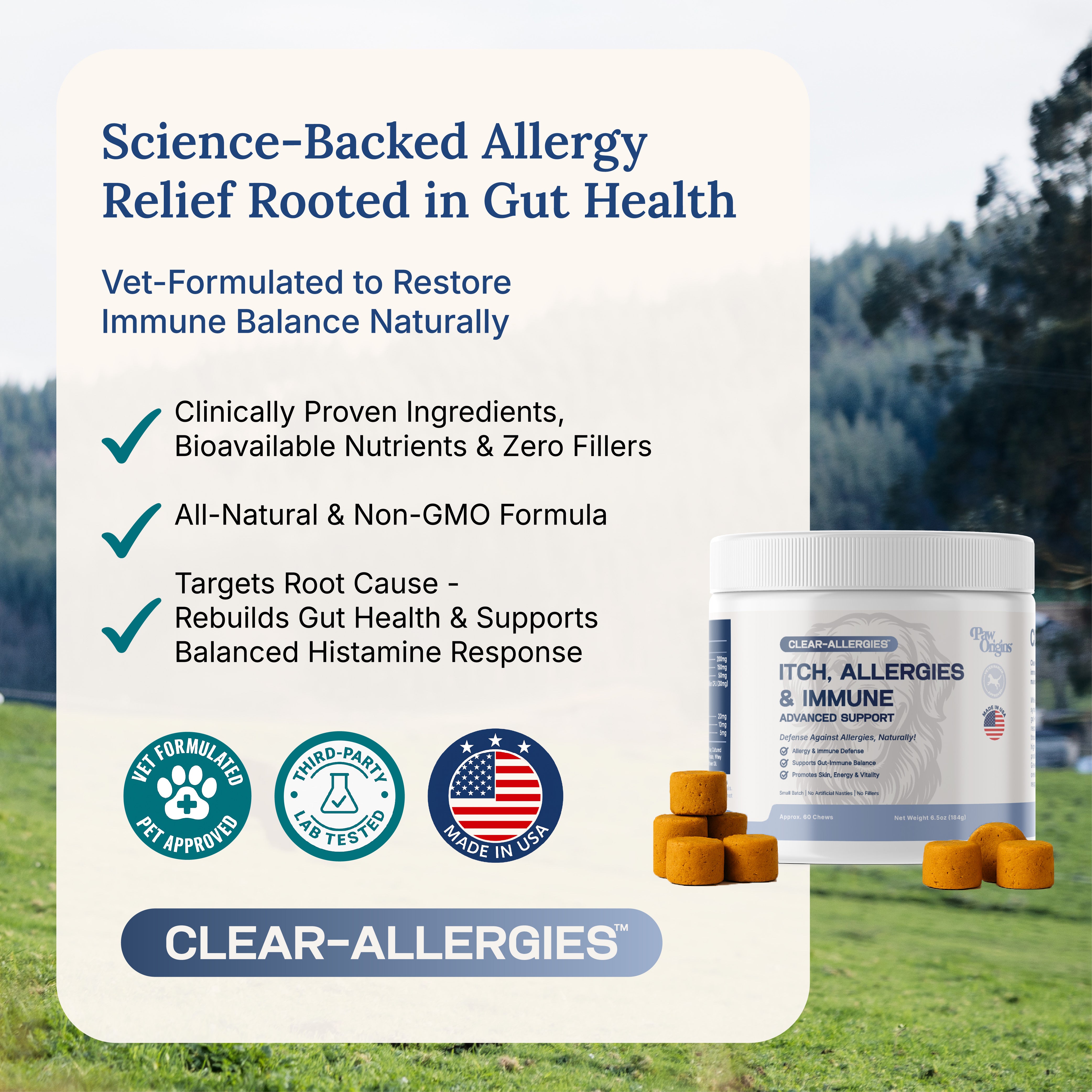 Clear-Allergies™ is different. It closes all three gates: sealing the gut barrier, calming the immune overreaction, and preventing histamine release before it starts — giving your dog lasting relief at the source.