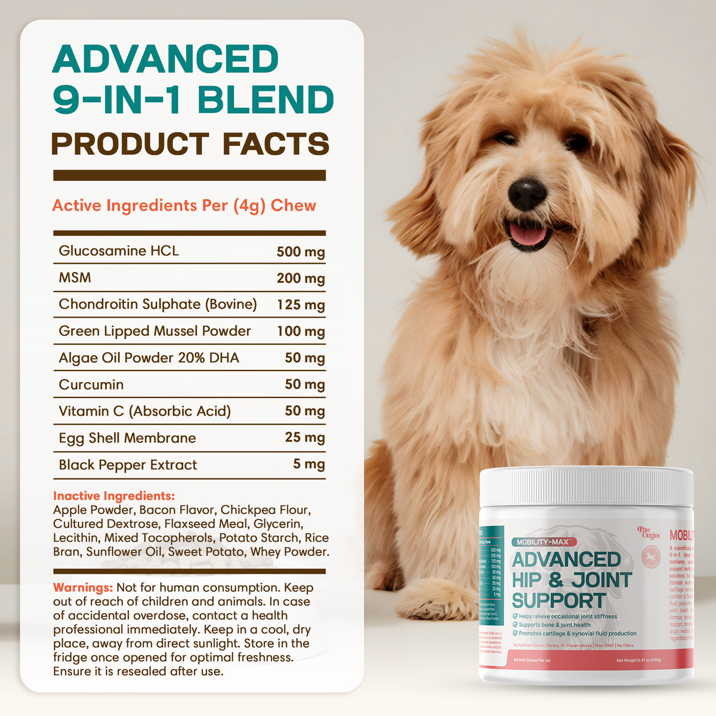 Mobility-Max™ is a scientifically formulated, advanced 9-in-1 blend of joint-supporting nutrients, specifically designed to address the root cause of canine joint issues - cartilage erosion.